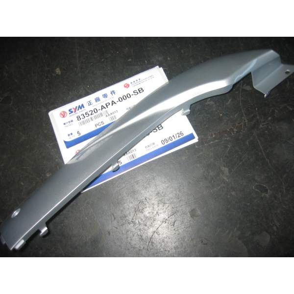 Descripción La pieza de repuesto quilla derecha plata número 83520-APA-000-SB es un recambio original de SYM, lo que significa que es exactamente la misma que la que se montó en la fábrica cuando el vehículo era nuevo.